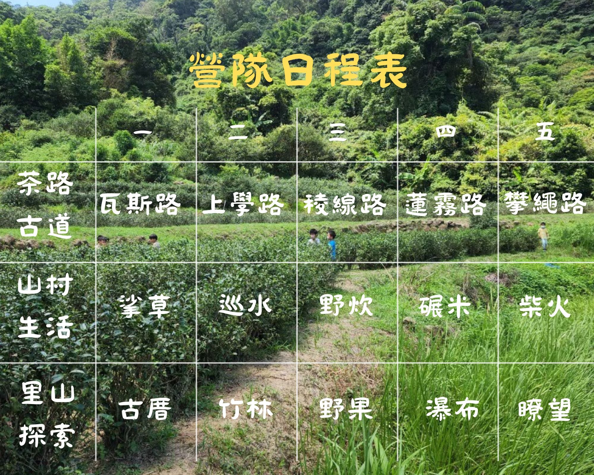 - 回顧與感謝:每日工作和遊戲告一段落後,好好回顧一日的發生,並感恩師長、同伴與大自然所給予的一切。