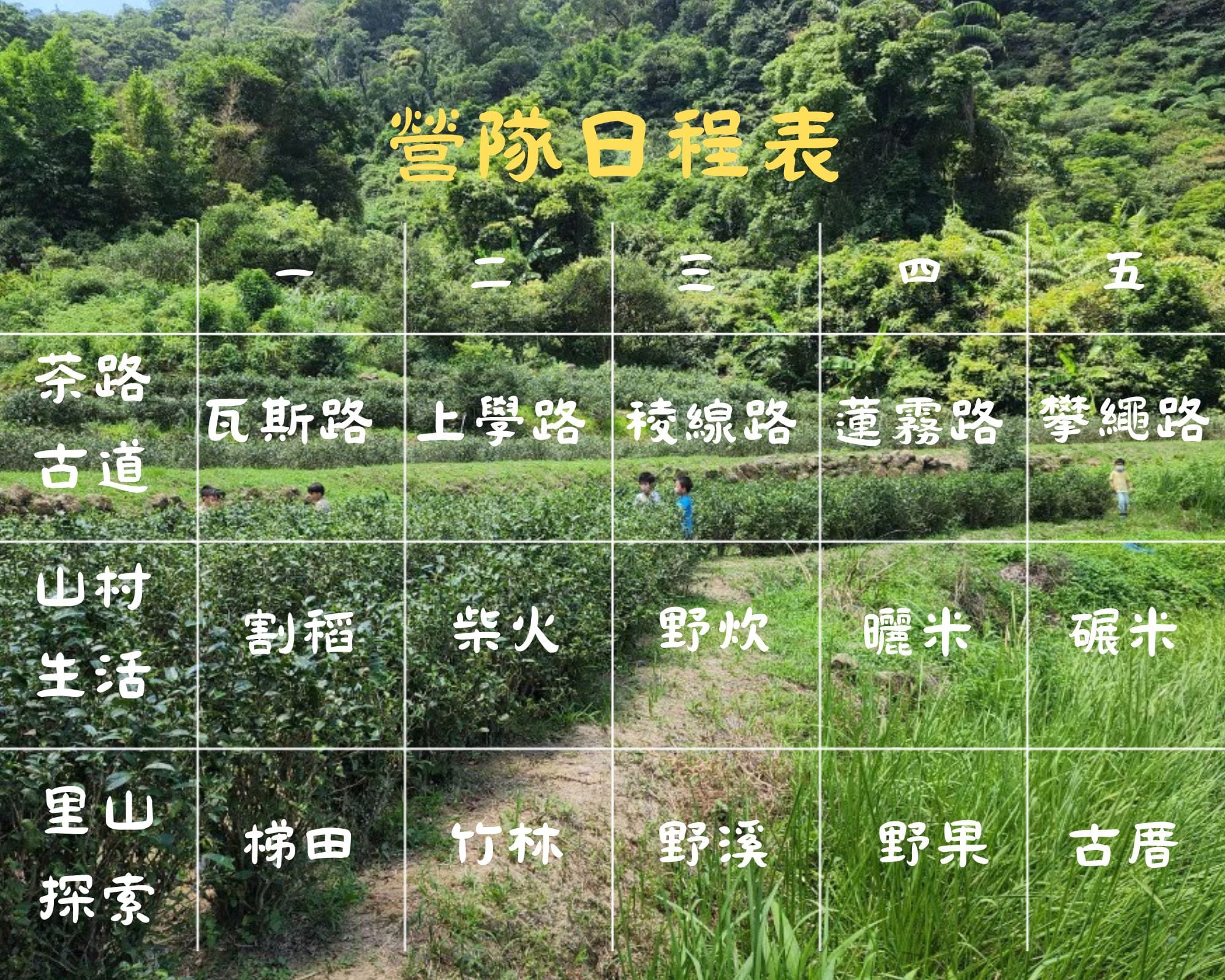 場域內自然與人文元素豐富多樣,是讓孩子開展身心的好所在。孩子身處期間,即悠遊在生態/人文地景豐富的水陸場域,營隊將安排走古道、水田活動、炊煮、自由遊戲,搭配適度的靜態活動。