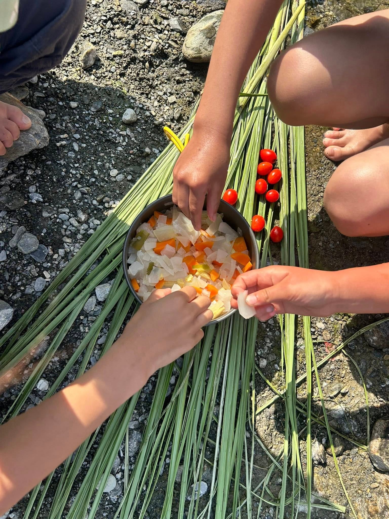 我們涉溪水,走入山林獵徑,找尋動物足跡,學獵人採集大自然素材,用山棕做成釣桿來釣魚,有些孩子在溪水旁泡腳、敲發光的石頭、曬日光浴,每個孩子透過溪水的流動,享受自由的清涼快樂的時間,孩子們物質身、乙太身、星芒體滿足不已,心靈渴望水元素的滋養,珍惜與水融合的沁涼。