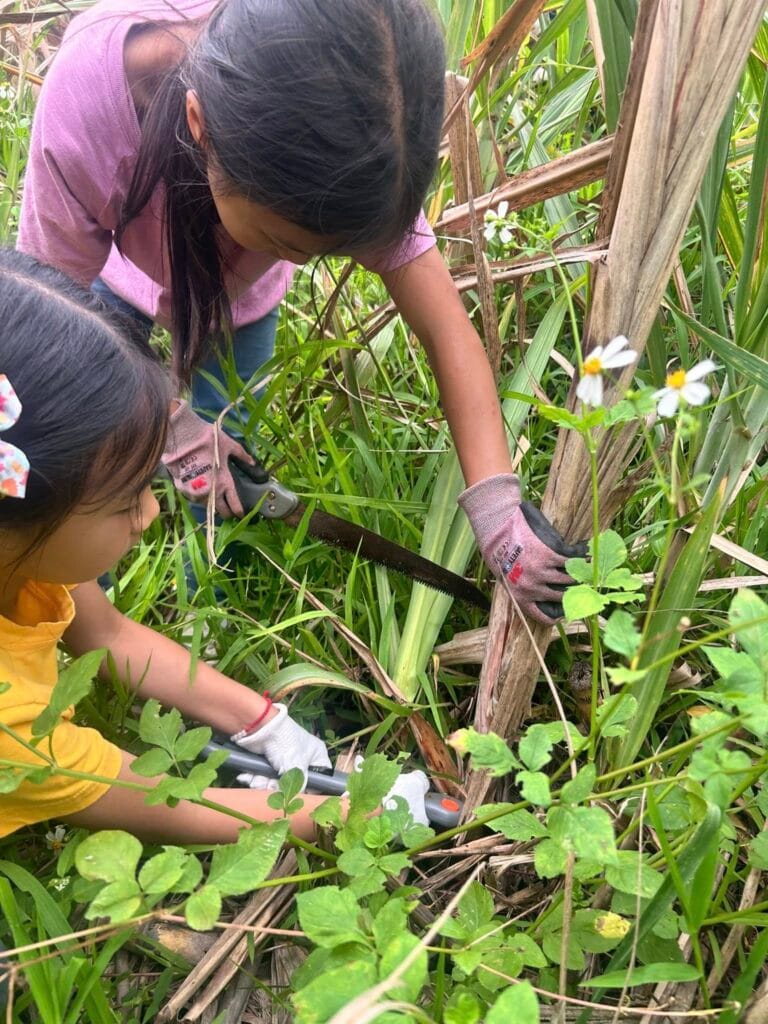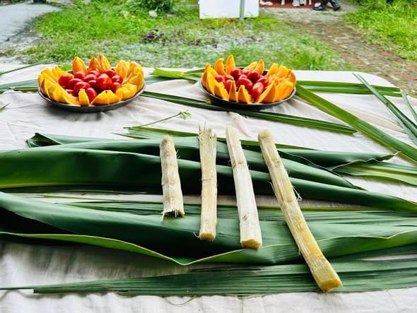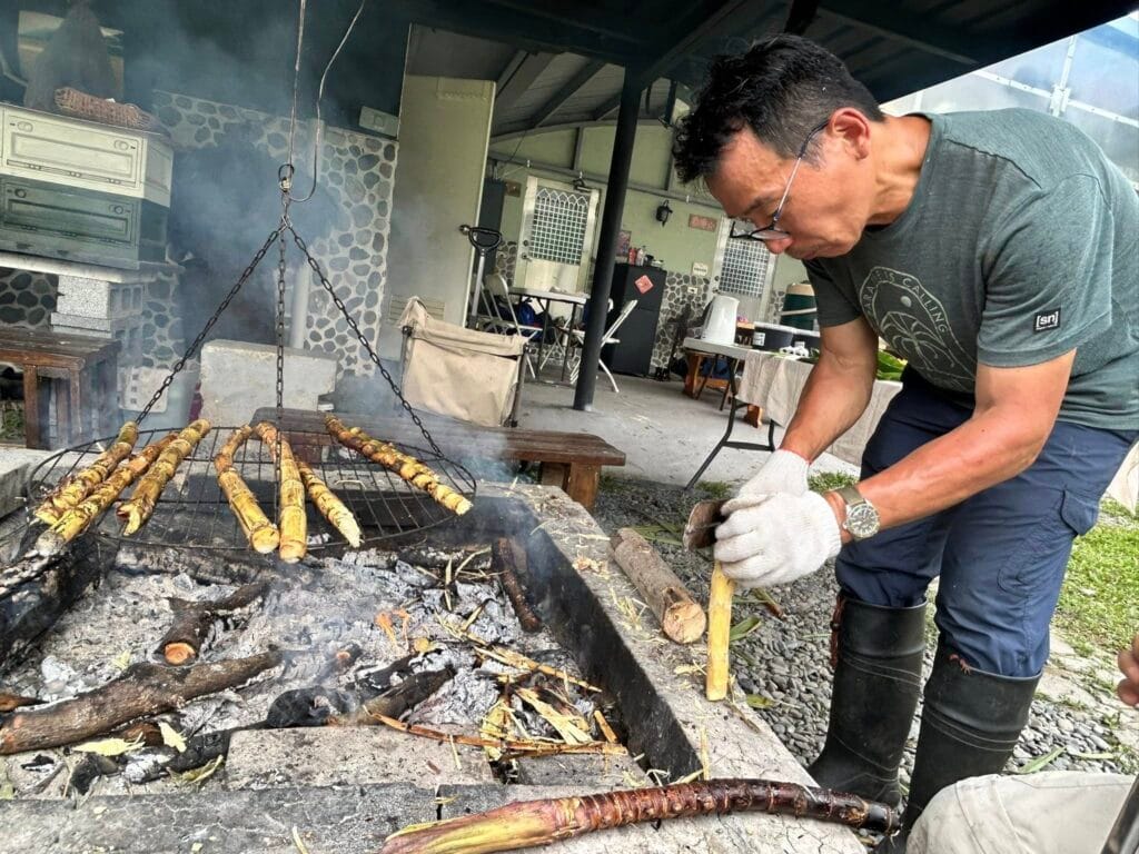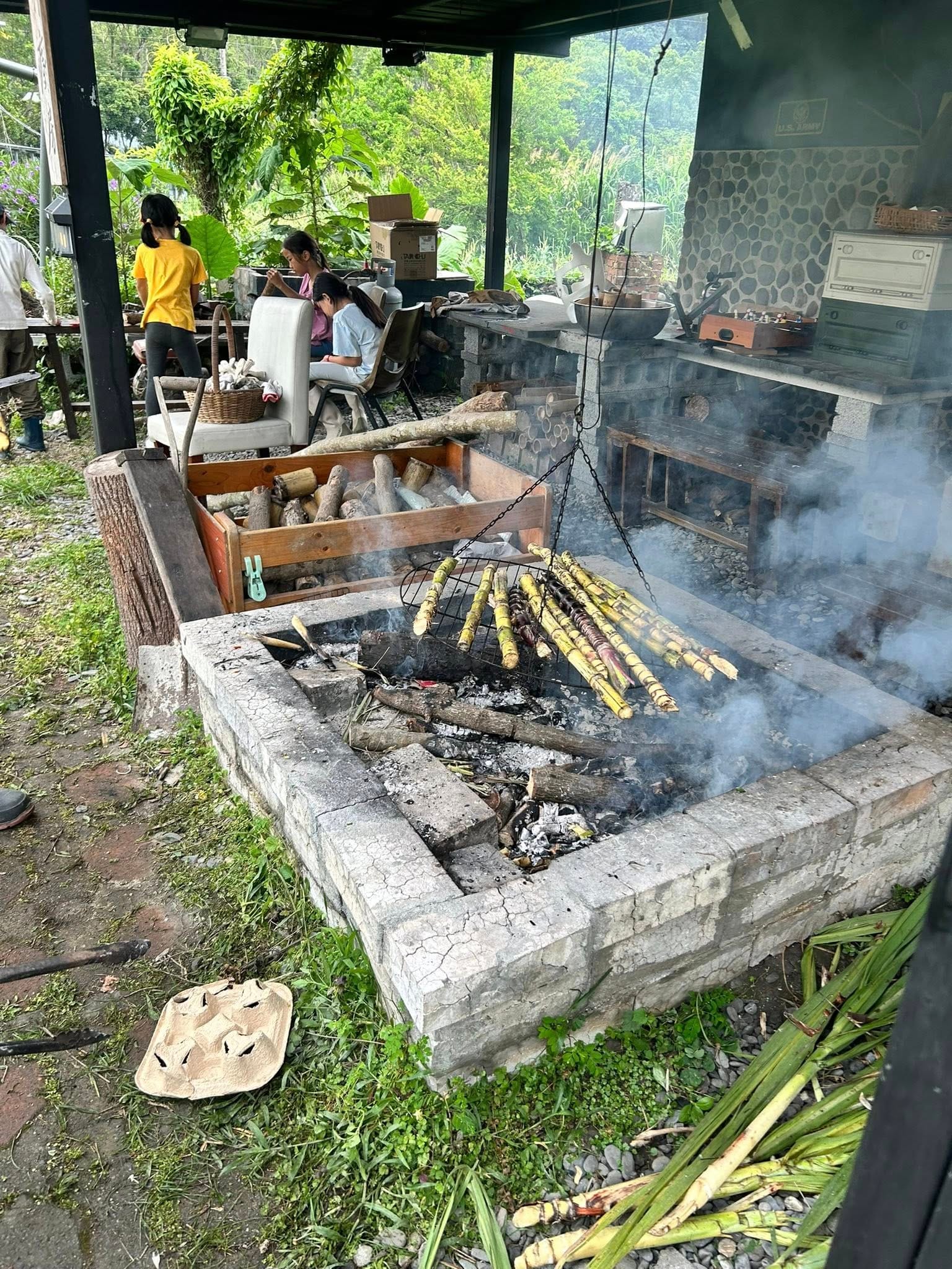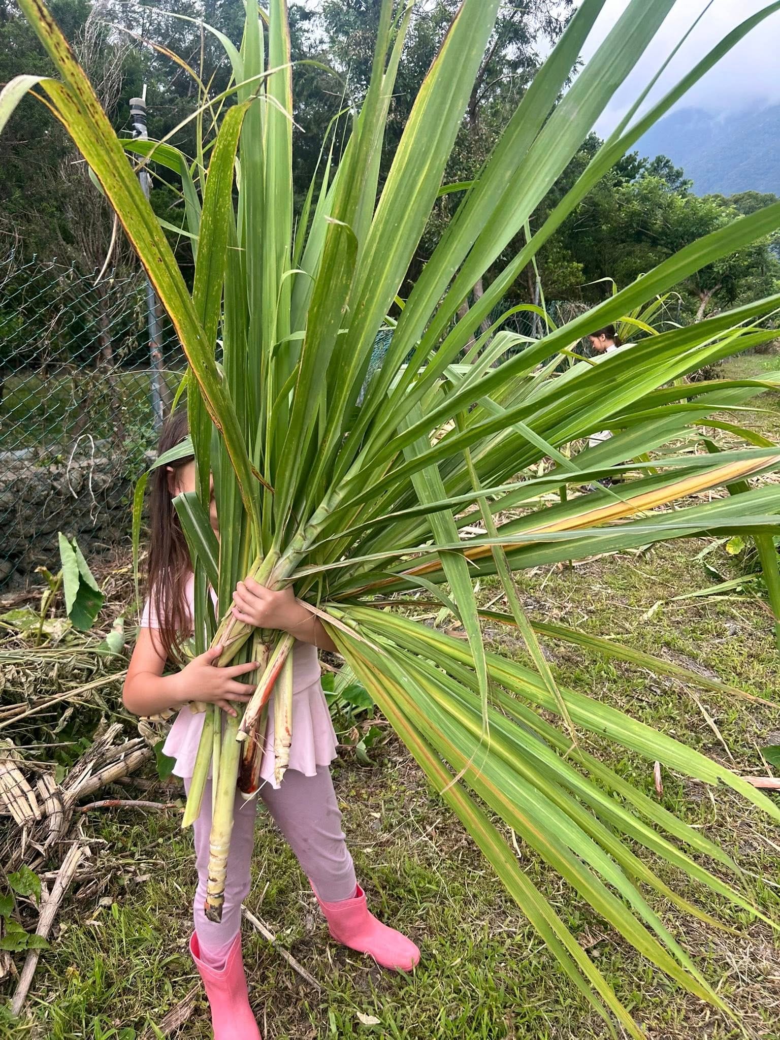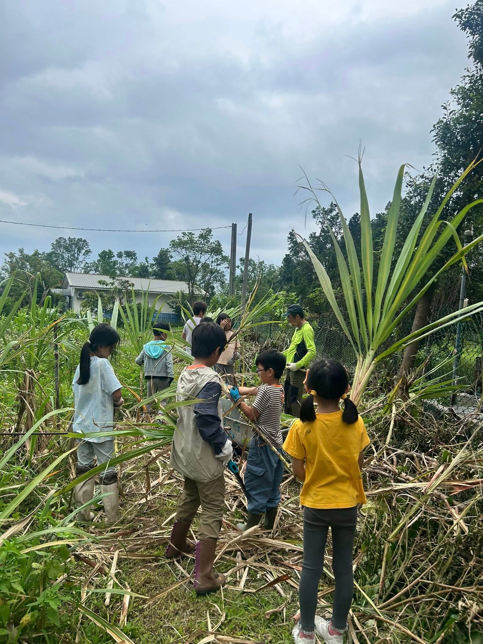 結束圈回顧,孩子們分享,我們一起做過什麼事、走過那些路、一起野炊煮飯、鋸甘蔗、鋸木頭、削樹皮、擲甘蔗鏢槍、現榨現喝甘蔗汁、生火烤熱甘蔗,啃著硬硬甜甜熱熱的甘蔗,被蚊子親的好癢好癢⋯