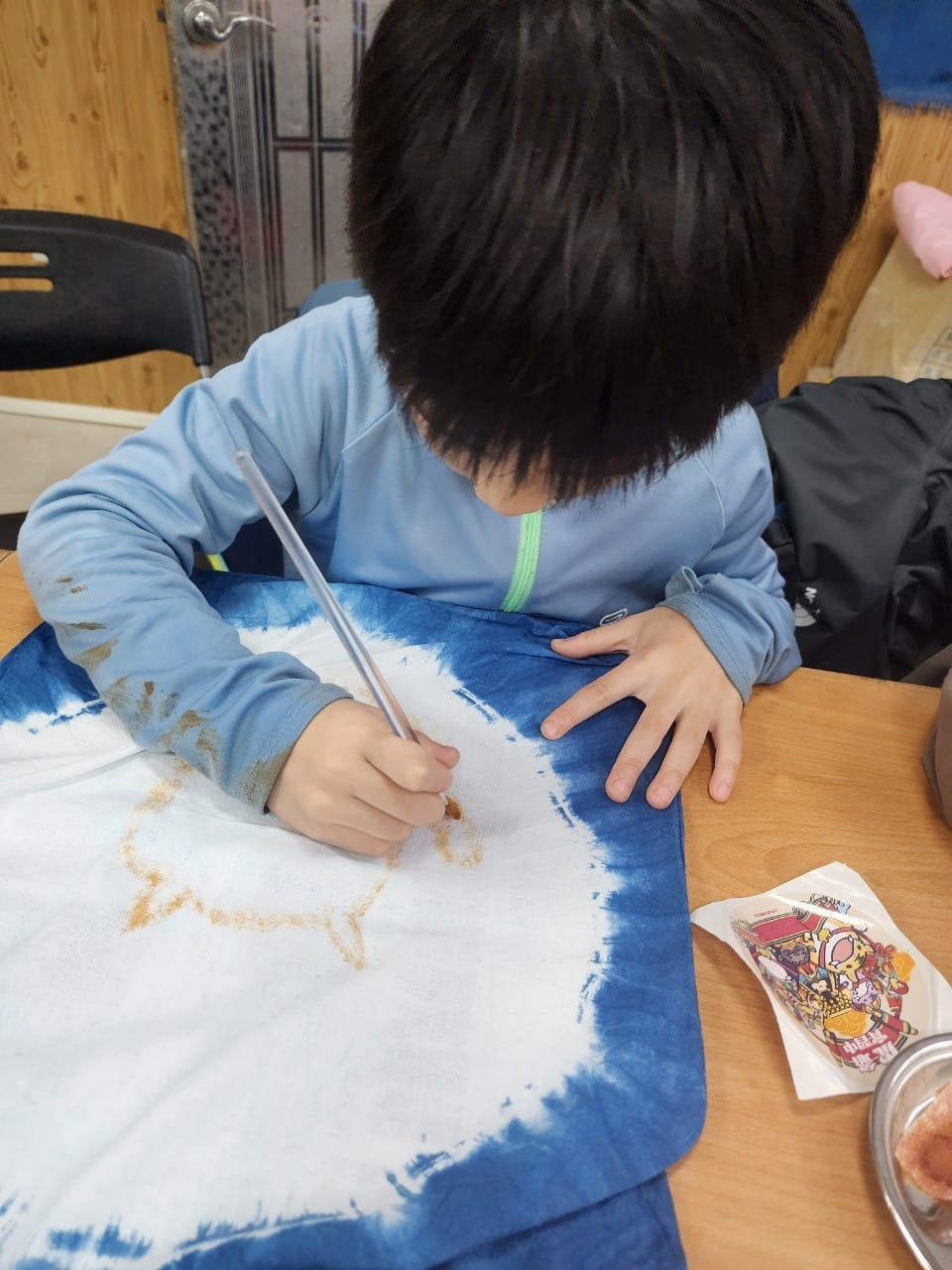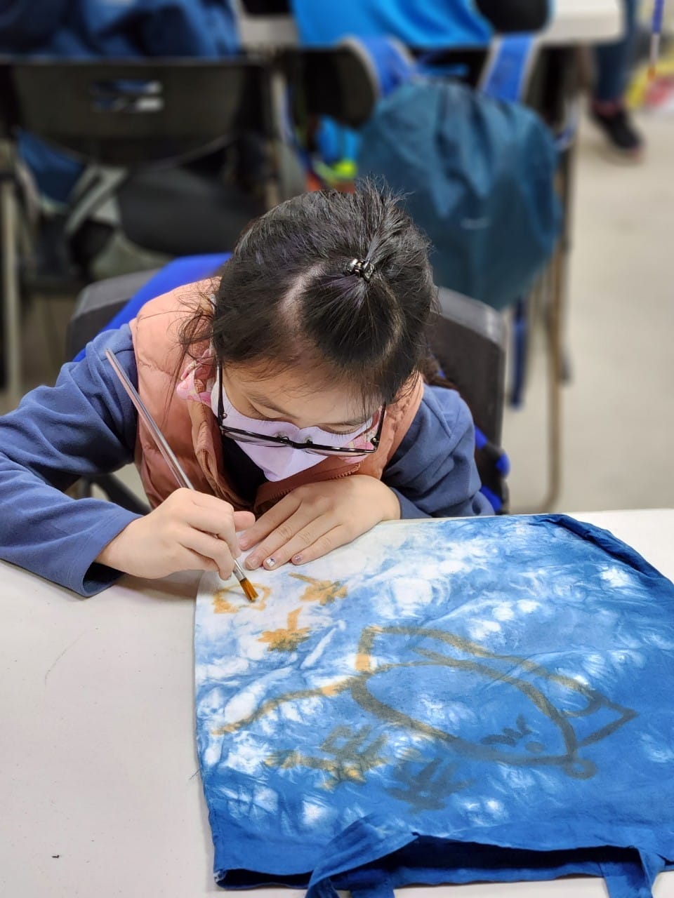孩子每天走一段古道,帶著古道上見證的、人與自然互動的故事,帶著地、水、火、風的滋養,回到農場,動起手腳工作。他們煮自己的午餐,協助收成段木香菇、山藥零餘子,榨薯榔汁液作染布顏料,學習藍染;最後,用自己採集植物,為自己的袋子染上顏色。他們用身體,用靈魂,經驗到「青出於藍,勝於藍」。